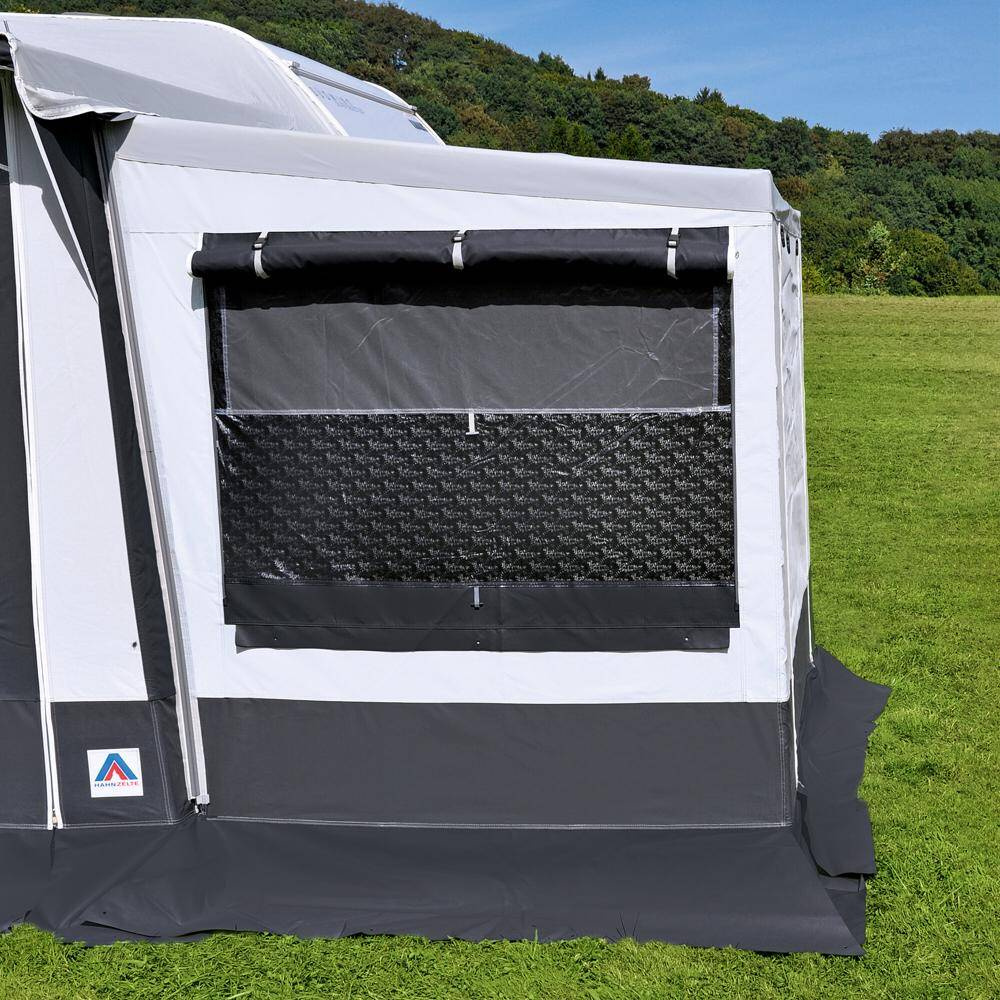 Anbau für das Reisevorzelt Meira. Er wird mittels Doppelkederprofil mit dem Zelt verbunden. Mit abdunkelbarem Fenster vorne und seitlichem, hochrollbarem Eingang. Gestänge: 25 mm Stahl, inkl. mittlerer Dachstrebe und Bügelfüßen.