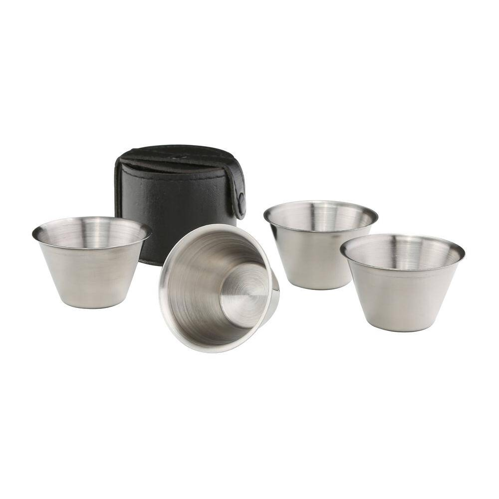 Vier kleine Edelstahlbecher in einem Lederetui. Ob bei der Skitour oder nach einem zünftigen Gipfelsieg – damit kann man auch unterwegs jemanden einladen.