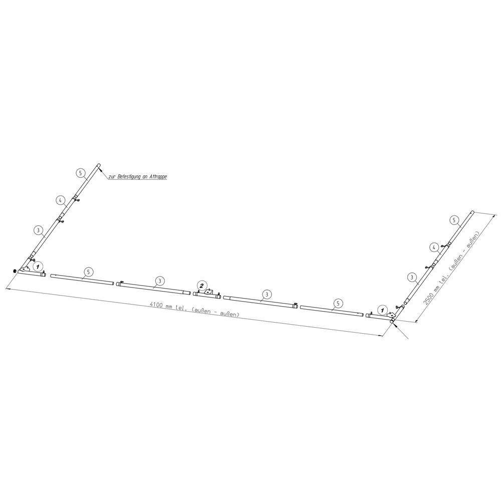 Für die Präsentation von Reisemobil- und Wohnwagen-Vorzelten in einer Ausstellung. Mit diesem Bodenrahmen können Zelte mit einer Grundfläche von 2,50 m x 4,10 m fixiert werden.Eine Erweiterung ist möglich.Material: Stahlrohr ø 28/25 mm x 1,0 mm, teleskopierbar.