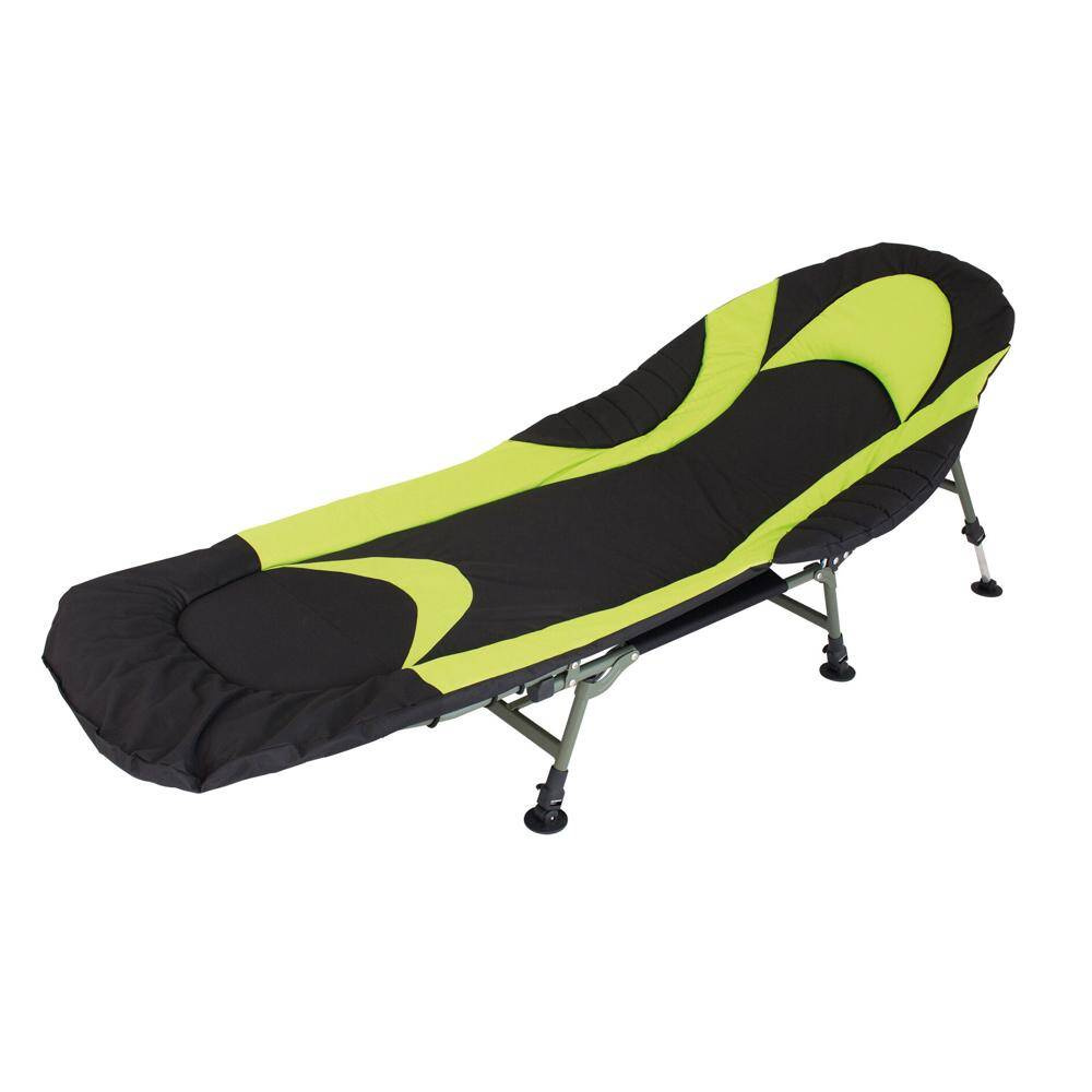 Bequemes Campingbett aus klappbarem Stahlrahmen mit weich gepolstertem Polyester-Oberteil. Verstellbare Rückenlehne mit verstellbarer Stütze.