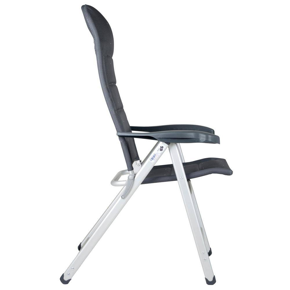 Die ergonomische Rückenlehne mit integriertem Kopfpolster ist 7-fach verstellbar. Außerdem ist der Stuhl durch sein verstärktes Aluminiumgestell bei einem sehr geringen Packmaß sehr stabil. Die rutschfesten Fußstopfen sorgen für einen sicheren Stand.&