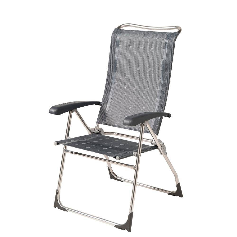 Campingstuhl aus Aluminium-Rundrohr, 8-fach verstellbare, hohe Rückenlehne.