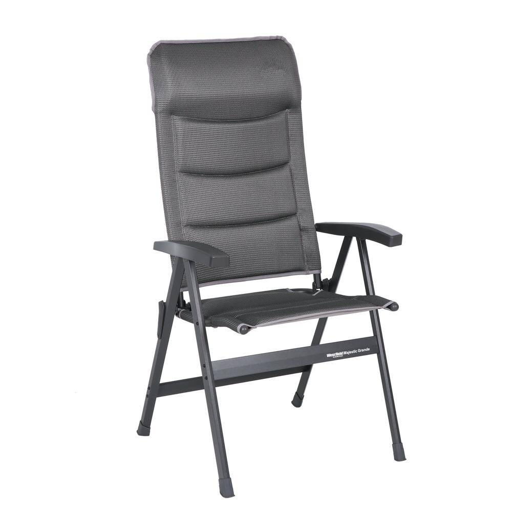 Aufgrund der leicht erhöhten Sitzhöhe von 50 cm ist der Majestic Grande bequemer für Menschen ab einer Größe von 1,75 m. Für noch mehr Komfort sorgt das DuraDore® 2D Material. Der Stuhl ist mit einem verstärkten, pulverbeschichteten Aluminiumrahmen versehen. Die spezielle Form des Aluminiumprofils ermöglicht ein optimales Packmaß.