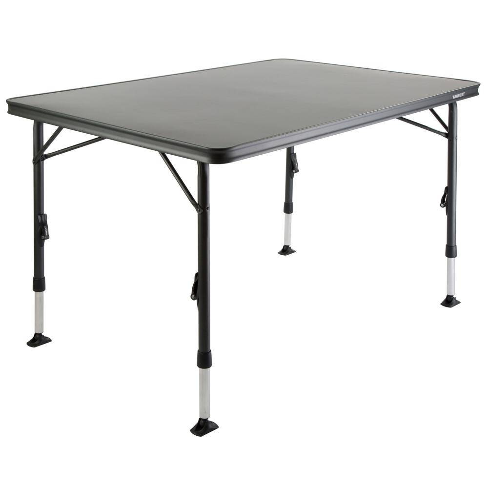 Leichter Campingklapptisch mit widerstandsfähiger Melamin-Tischplatte. Dank der vier verstärkten, regulierbaren Tischbeine von 28 mm Durchmesser und der seitlichen Verstrebungen ist auf jedem Untergrund ein fester Stand gegeben.