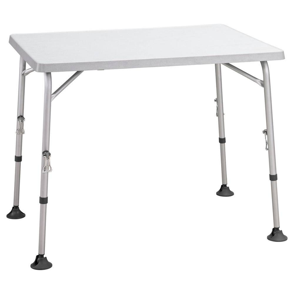 Der ideale Tisch für zwei Personen überzeugt durch sein äußerst geringes Gewicht und sein kompaktes Packmaß. Die in einem Stück hergestellte Kunststoff-Tischplatte ist resistent gegen Feuchtigkeit und andere Umwelteinflüsse. Alle vier Beine sind stufenlos verstellbar. Aluminium-Untergestell.