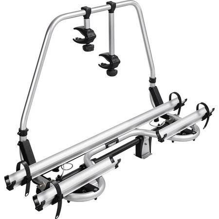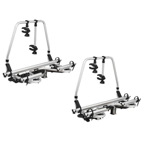 Universell passender, mit Kippmechanismus ausgerüsteter Premium-Deichselträger, zur Justage des Kippwinkels dient das Tilt-Stop-System. Überzeugend ist auch seine sichere und einfache Plattformverriegelung. Er hat eine Tragkraft von 60 kg (mit max. 30 kg je Schiene) und kann in beiden Schienen E-Bikes transportieren. Der Träger, der zusätzlich mit einer 3. Schiene erweiterbar ist, wird mit 2 Abstandshaltern und Radgurten geliefert. Die nicht für ein 3. Fahrrad erweiterbare Short Version eignet sich für Deichseln, die eine kürzere Baulänge haben und somit weniger Platz zur Montage bieten. Gewicht 9,7 kg, Short Version 9,6 kg.