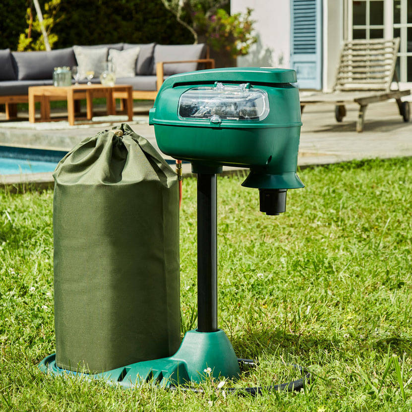 - Lockt und fängt Mücken und andere stechende Insekten wie Mücken, Kriebelmücken usw. Eine innovative Technologie, bei der Kohlendioxid, Wärme und ein spezieller Lockstoff (Acetol - das den menschlichen Atem imitiert) freigesetzt werden, so dass sich die Insekten in der Nähe des Geräts ansammeln und das Gebiet für Menschen und Tiere frei wird;