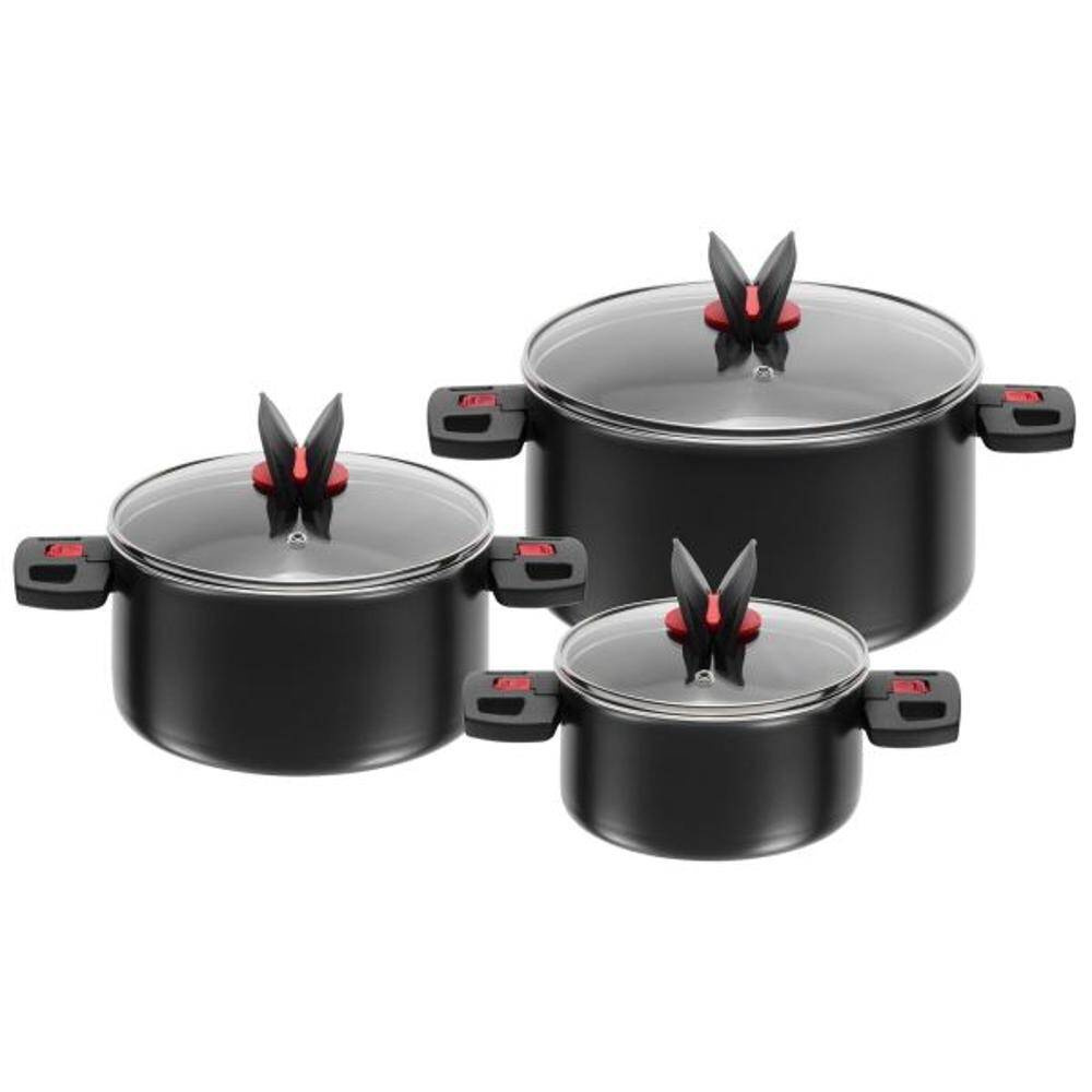 Ineinander stapelbar. Mit passenden Glasdeckeln. Geeignet für Gas-, Elektro- und Keramikkochfeld.