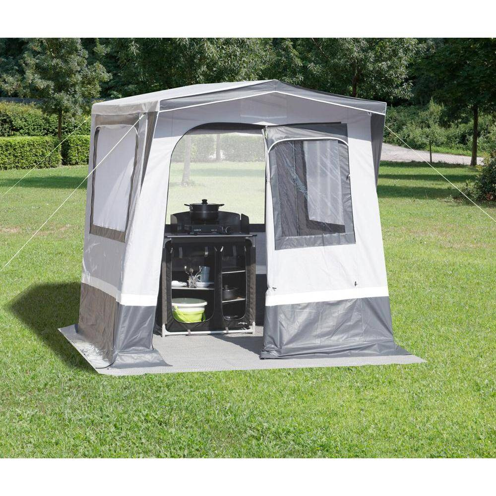Multifunktionszelt, dient perfekt als Küchen- und Gerätezelt zum Schutz aller Gegenstände, die nicht im Freien gelassen werden können. Die gesamte Zelthaut besteht aus PVC und wird von einem stabilen Stahlgestell getragen. Drei große Fenster mit Moskitogaze und einer effizienten Hochentlüftung sorgen für eine optimale Dauerbelüftung. Mit breiter Eingangstür, die seitlich aufgerollt werden kann. Mit Rundum-Schmutzstreifen. Gestänge:& ø 22 mm Stahlgestänge.