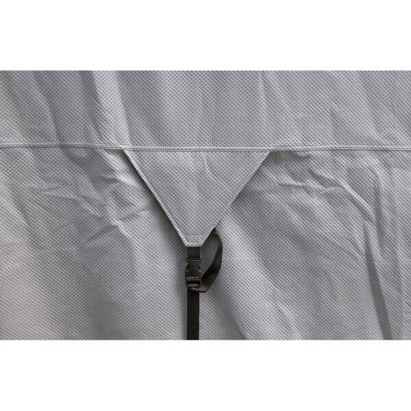 Universell passende Dachschutzplane für Wohnwagen, hergestellt aus hochwertigem SFS-3 Planenmaterial mit einem Gewicht von 160 g/m2. Das 3-lagige Material ist besonders atmungsaktiv und wasserabweisend und beugt so Kondenswasser- und Schimmelbildung vor. Lieferung erfolgt inklusive Packtasche, Abspannleinen und einem Reparaturset.