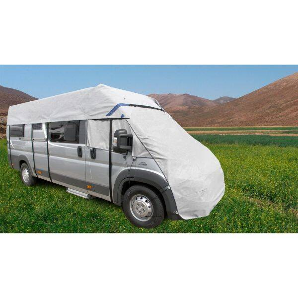 Die Dachschutzplane lässt sich auch perfekt mit der Reisemobil-Frontschutzplane Supra aus dem gleichen Tyvek Material kombinieren. So wird neben dem Dach auch die Fahrzeugfront optimal vor Vereisung, Schnee und Sonneneinstrahlung geschützt (Art.-Nr. 85 663, siehe Katalogseite 319).