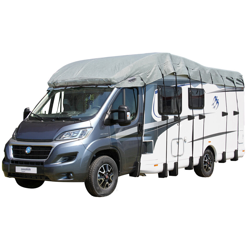 Die atmungsaktive Schutzplane ist aus 3-lagigem SFS-3 Nonwoven Material hergestellt und zeichnet sich durch eine gute Reißfestigkeit und geringes Gewicht aus. Mit ihrer frei wählbaren Länge passt sie universell für Wohnwagen und Reisemobile. So kann auf Wunsch nicht nur das Dach, sondern auch der Bug- und/oder Heckbereich vor Regen, Schmutz, Eis und Schnee und Verunreinigung durch Vögel und Bäume geschützt werden. Für die Anbringung ist die Plane ringsum mit dreieckigen Laschen versehen, an denen die im Lieferumfang enthaltenen Spanngurte befestigt werden. Lieferung erfolgt inklusive Reparaturset und großzügig bemessenem Aufbewahrungssack.