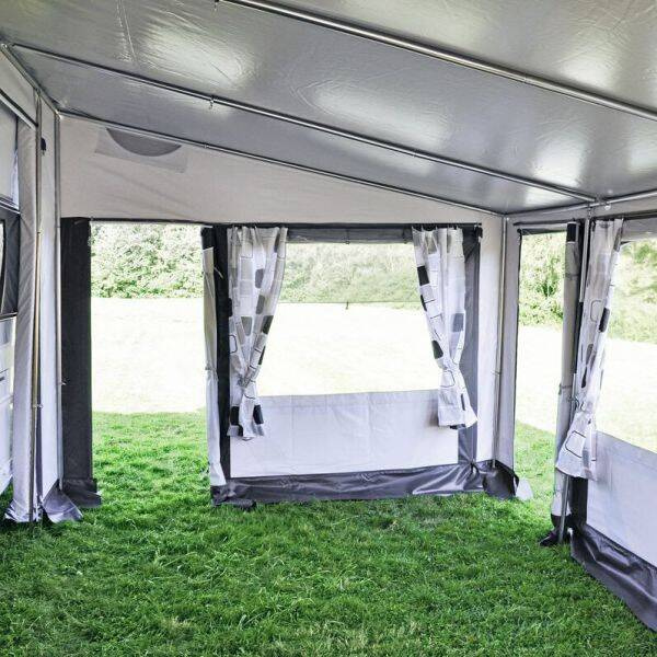 Das freistehende, wetterfeste Vorzelt ist komplett aus PVC. Ein doppelter Erdstreifen mit angenähtem Keder ermöglicht es, spezielle Abspannhaken nach Wunsch zu verschieben. Hohlsäume am Vordach und innen unter den Fenstern sowie Sturmleisten unter allen Fenstern außen ermöglichen eine zusätzliche Gestänge-Montage (Sturmgestänge). Alle Fensterklappen lassen sich mit einem Reißverschluss verschließen. Dreiseitiger Dachüberstand ca. 25 cm und 40 cm breite Überwurflasche, längsseitig zur Fahrzeugwand.& Mit sechs bereits montierten Sturmclips (Sturmgurte optional erhältlich).
