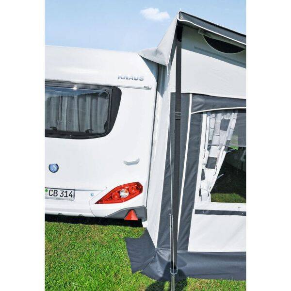 Das freistehende, wetterfeste Vorzelt ist komplett aus PVC. Ein doppelter Erdstreifen mit angenähtem Keder ermöglicht es, spezielle Abspannhaken nach Wunsch zu verschieben. Hohlsäume am Vordach und innen unter den Fenstern sowie Sturmleisten unter allen Fenstern außen ermöglichen eine zusätzliche Gestänge-Montage (Sturmgestänge). Alle Fensterklappen lassen sich mit einem Reißverschluss verschließen. Dreiseitiger Dachüberstand ca. 25 cm und 40 cm breite Überwurflasche, längsseitig zur Fahrzeugwand.& Mit sechs bereits montierten Sturmclips (Sturmgurte optional erhältlich).