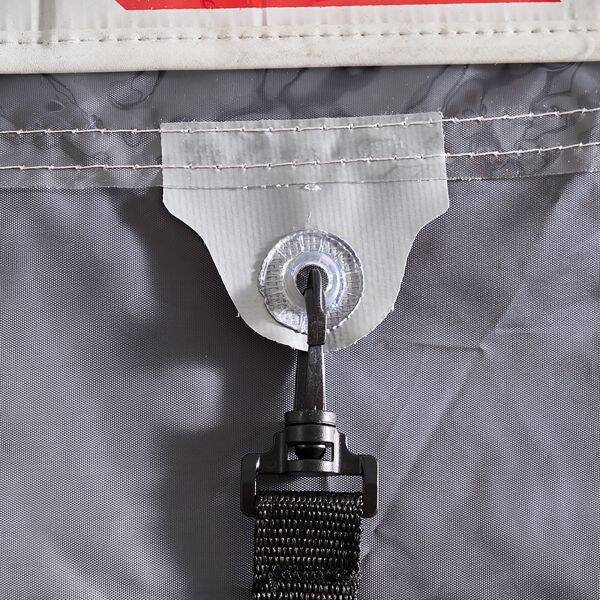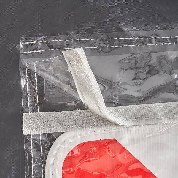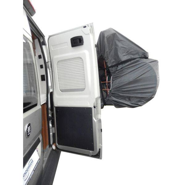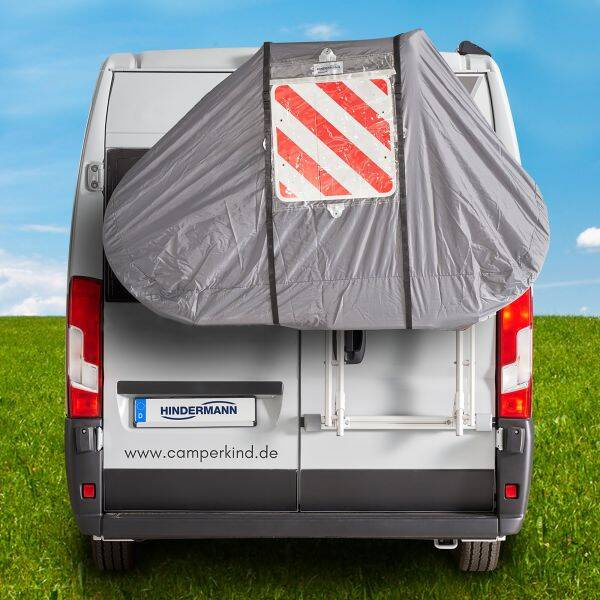 Die Schutzhülle für 3 Fahrräder wird von hinten aufgezogen und deckt auch die Unterseite des Trägers ab. Rückseitig sind bereits 2 Gummispanner eingearbeitet. Die aufgenähte Glasklartasche für eine Warntafel dient auch der Befestigung von optional bestellbaren Spanngurten. Material Polyester 210D, hinten mit hochwertiger PU-Beschichtung.