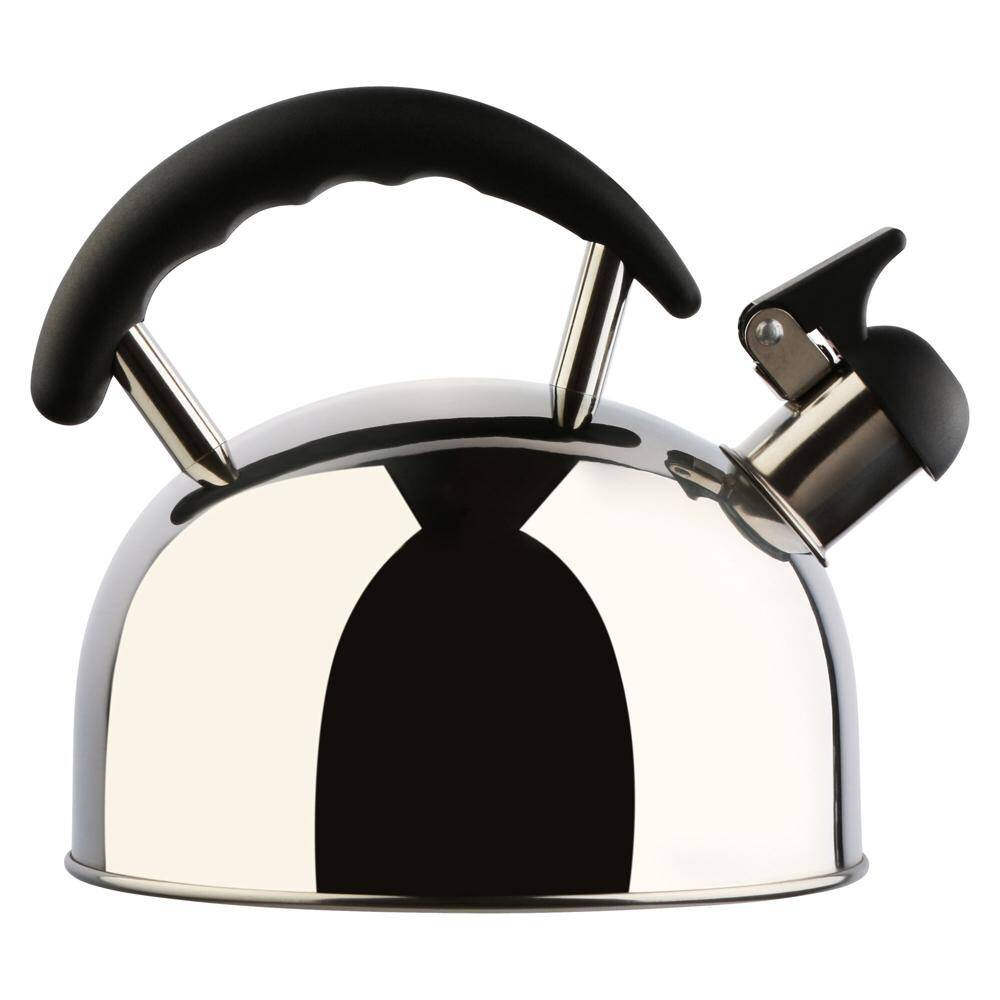Leichter Edelstahl-Flötenkessel mit Signalpfeife, wärmeisoliertem Griff, großer Einfüllöffnung. Nicht für Induktion geeignet.