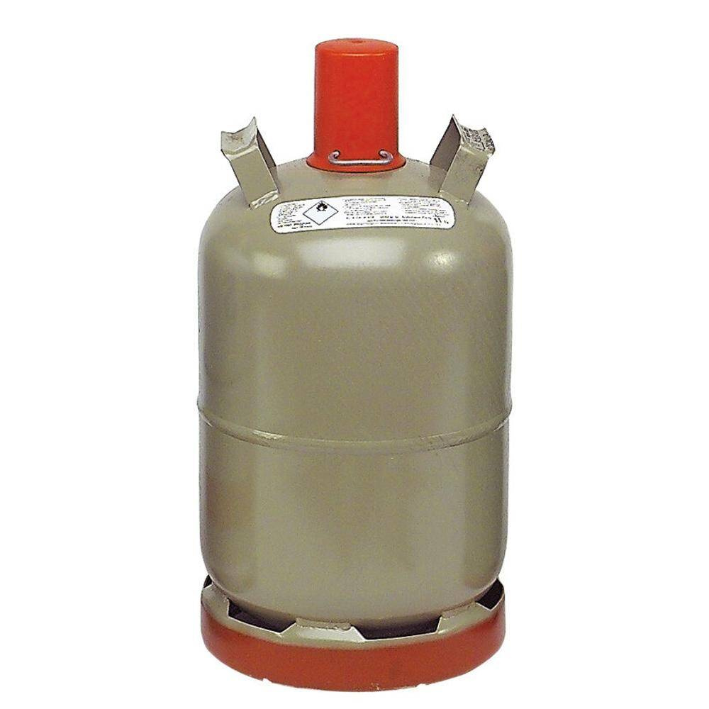 Gasflasche mit Ventil und Schutzkappe, amtl. geprüft, leer; mit Schutzmantel, für Propan/Butan-Füllung.