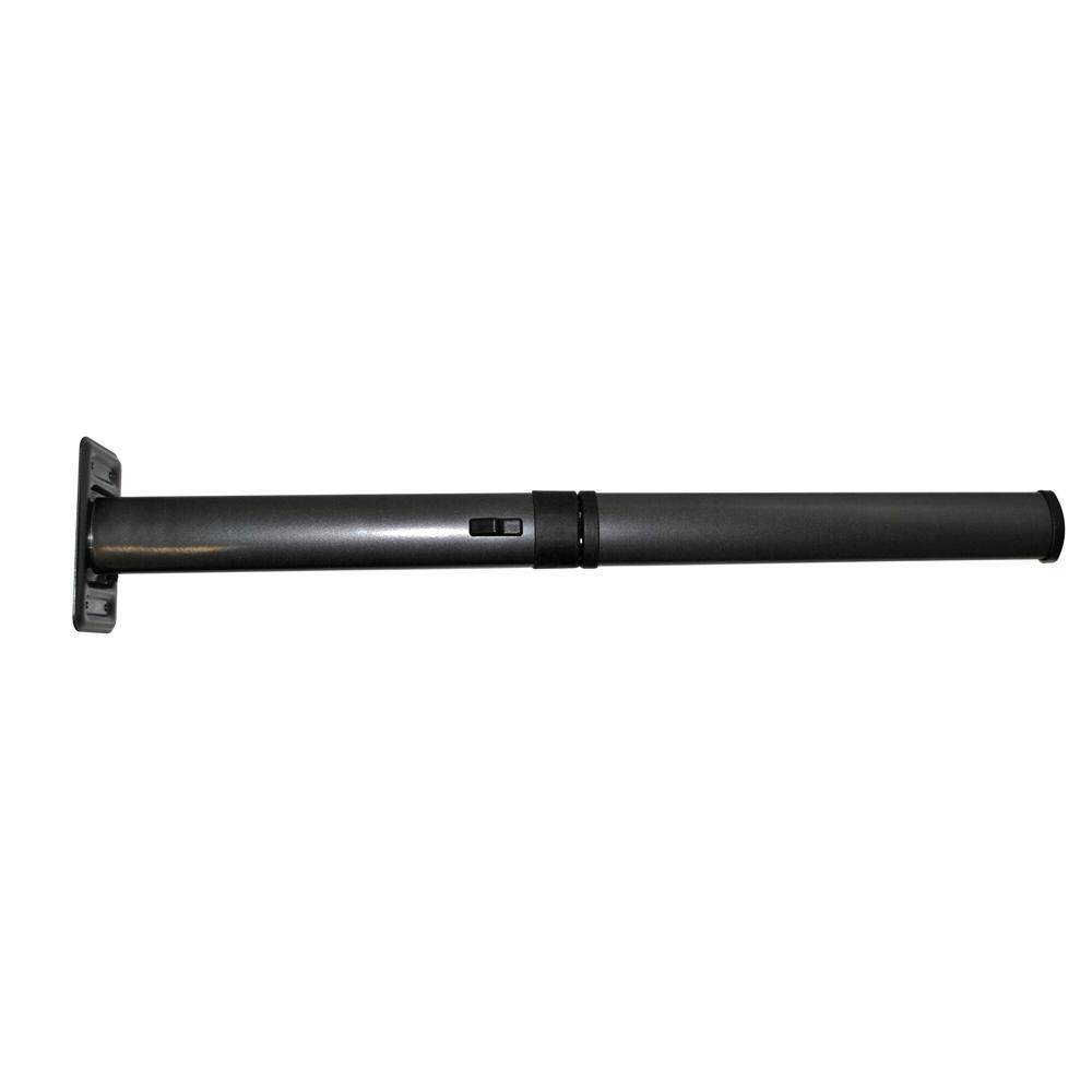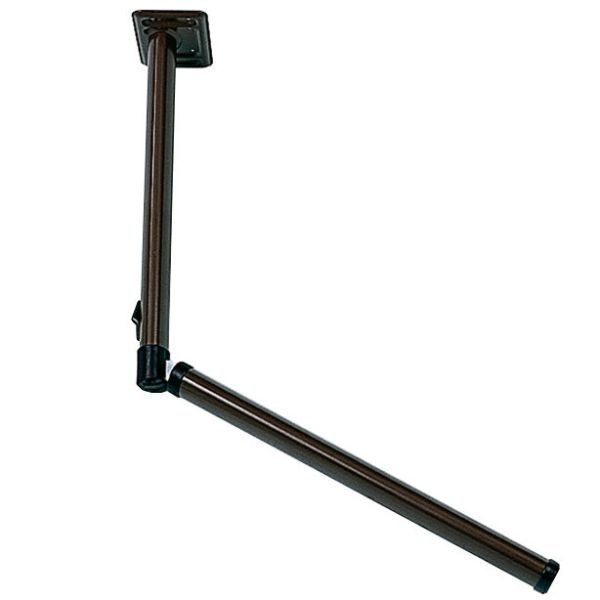 Stützfuß mit Knick in der Mitte aus Aluminium-Ovalrohr (50 x 25 mm). Einrastbar in beiden Höhenstellungen mittels Schiebetaste. Gesamthöhe 67,5 cm; abgeklappte Höhe 31,5 cm.