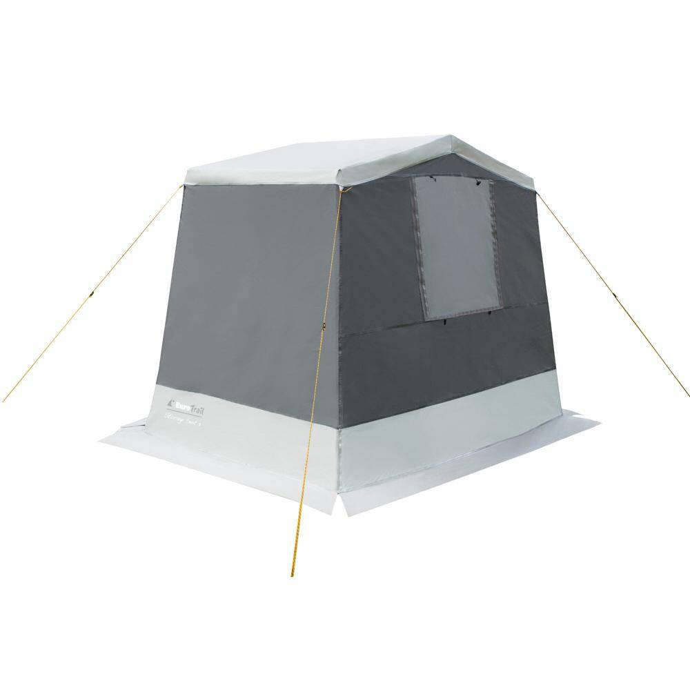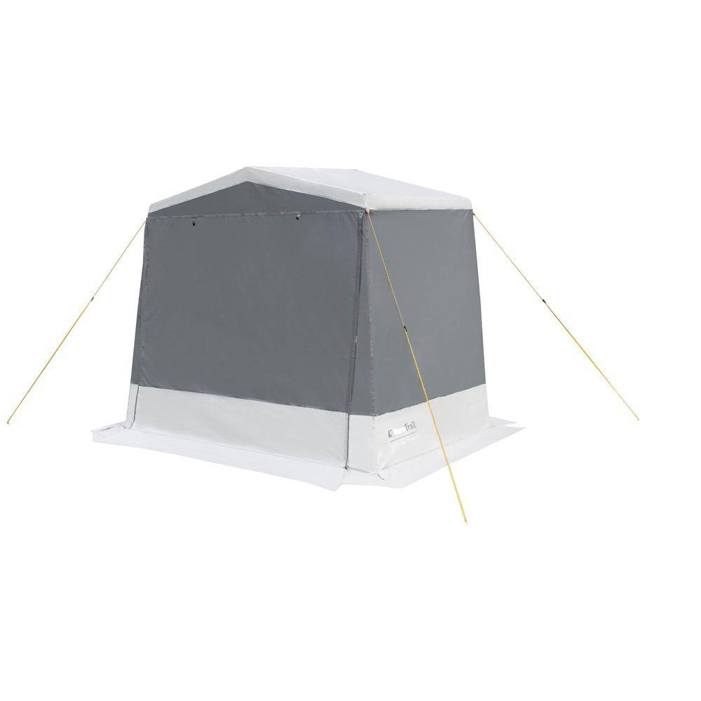 Ein Muss für jeden Dauercamper. Große Beständigkeit gegen Umwelteinflüsse. Einfacher Aufbau. Die Vorderwand (hochrollbar) ist mit zwei senkrechten, abgedeckten Reißverschlüssen ausgestattet. Mit Sturmabspannschlaufen und Belüftungsfenster. Material: Polyester mit PVC-Beschichtung. Gestänge: ø 22 mm Stahl.