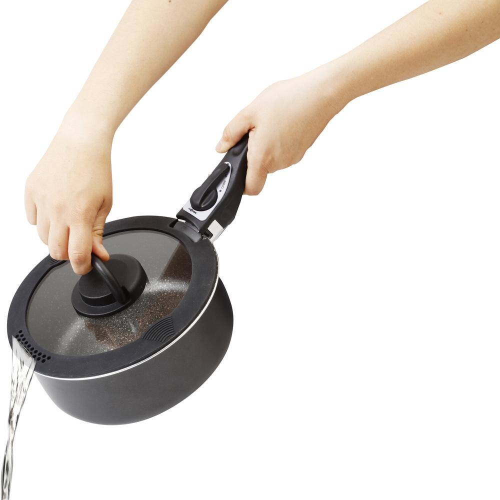 Glasdeckel mit Silikon-Lärmschutzrand, Sieböffnung und Schlitz zur Befestigung der Griffzangen.