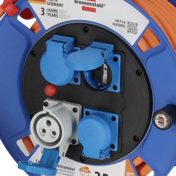 CEE-Kabeltrommel mit CEE-Stecker 230 V/16 A, 1x CEE-Steckdose 230 V/16 A und 3x spritzwassergeschützten Schutzkontakt-Steckdosen 230 V für eine ideale Stromversorgung