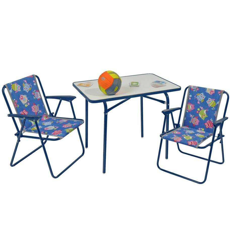 Besteht aus 2 Klappstühlen mit stabilem Stahlrohr-Gestänge, Maße je B 40 x H 54 x T 40 cm, Gewicht 1,4 kg sowie einem Tisch mit wetterfester Platte, ebenfalls mit Stahlrohrgestänge, Maße B 60 x H 49 T 40 cm, Gewicht 3,7 kg.