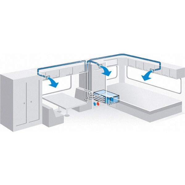 Angenehm leise arbeitende Staukastenklimaanlage für Reisemobile und Caravans. Der erzeugte Luftstrom wird über 3 Austrittsöffnungen gleichmäßig verteilt, mit Hilfe von Zubehör können die Öffnungen individuell im Fahrzeug positioniert werden – konzentriert an einer Stelle oder auch in verschiedenen Räumen. Sie wiegt nur 21 kg, ist extrem kompakt gebaut und eignet sich für Fahrzeuge mit einer Länge bis 8 m. Sie verfügt über ein energieeffizientes Wärmepumpensystem zum Kühlen und Heizen. Der Softstart gewährleistet problemlosen Anlauf selbst bei schwacher Absicherung. Über das optionale 12-Volt-Anschlusspaket DSP-T 12 (Art.-Nr. 72 813) lässt sie sich auch während der Fahrt betreiben.