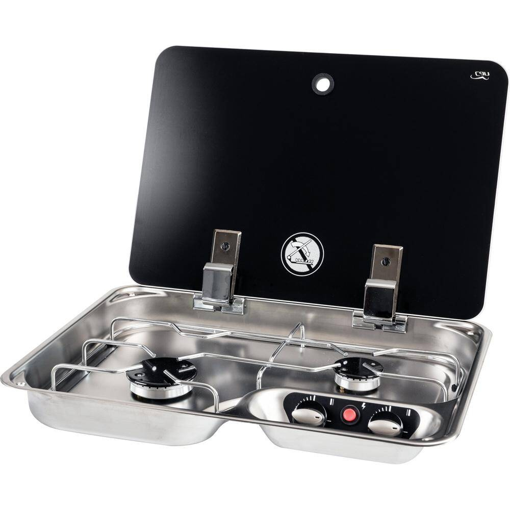 Einbau-Kochmulde mit Abdeckung aus gehärtetem Sicherheitsglas. Mit elek-trischer Zündung (Anschlussspannung 12 Volt wird benötigt) und Sicherheitszündsystem; inklusive Dichtung; Anschlussdruck 30 mbar, Leistung 1 x 1 kW, 1 x 1,7 kW, Verbrauch 1 x 73 g/h, 1 x 124 g/h. Einbautiefe 8 cm, Ausschnittmaße 44 x 32 cm, Außenmaße 46 x 33,5 cm, Gewicht 4,6 kg.