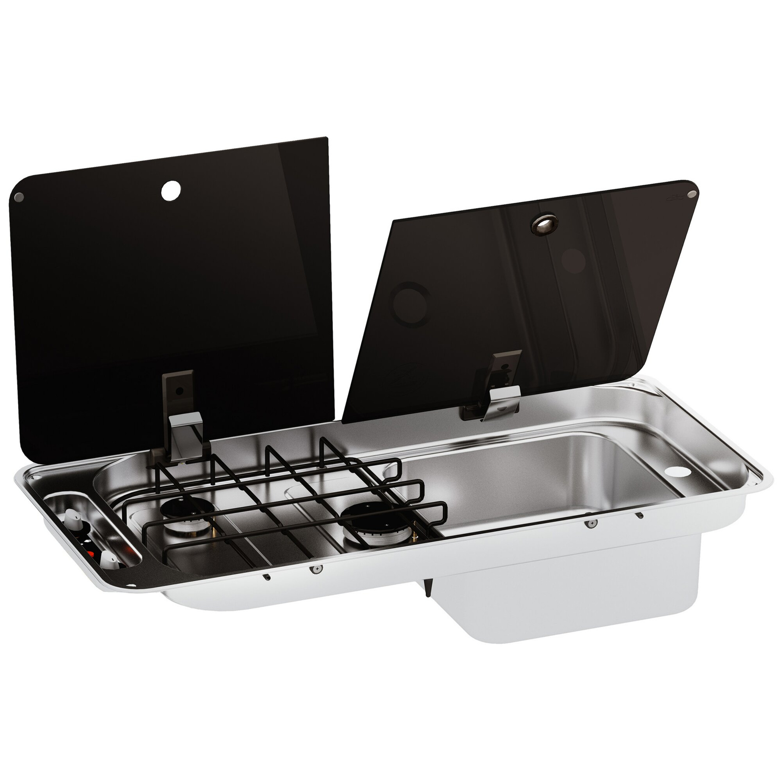 Einbau-Kocher-Spülenkombination mit Abdeckung aus gehärtetem Sicherheitsglas und Bohrung für Wasserhahn (ø 27 mm), Art.-Nr. 41 861; inklusive Ablaufarmatur und Dichtung. Piezo-Zündung und Sicherheitszündsystem mit Thermoelement; Anschlussdruck 30 mbar, Leistung 1 x 1 kW, 1 x 1,7 kW, Verbrauch 1 x 73 g/h, 1 x 124 g/h. Einbautiefe 15 cm, Ausschnittmaße 70 x 32 cm, Außenmaße 71,6 x 34 cm, Gewicht 5,6 kg.