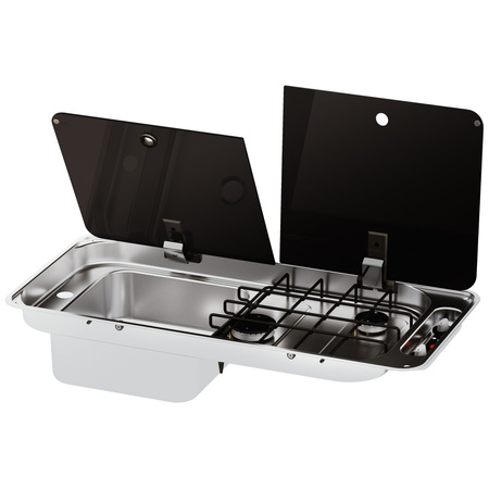 Einbau-Kocher-Spülenkombination mit Abdeckung aus gehärtetem Sicherheitsglas und Bohrung für Wasserhahn (ø 27 mm), Art.-Nr. 41 861; inklusive Ablaufarmatur und Dichtung. Piezo-Zündung und Sicherheitszündsystem mit Thermoelement; Anschlussdruck 30 mbar, Leistung 1 x 1 kW, 1 x 1,7 kW, Verbrauch 1 x 73 g/h, 1 x 124 g/h. Einbautiefe 15 cm, Ausschnittmaße 70 x 32 cm, Außenmaße 71,6 x 34 cm, Gewicht 5,6 kg.