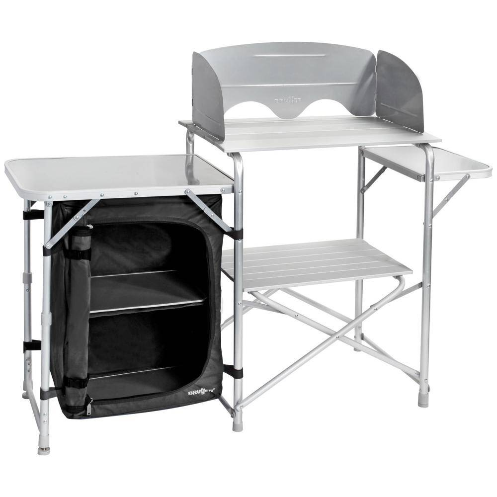 Die perfekte Kombination aus Küche und Vorratsschrank mit klappbarem Alu-Gestell. Der seitlich angebrachte Schrank mit 2 internen MDF-Ablagen ist aus widerstandsfähigem Polyester gefertigt und lässt sich mittels RV komplett verschließen. Einfacher Auf- und Abbau. Ein Windschutz aus Metall und eine praktische Transporttasche sind im Lieferumfang enthalten.