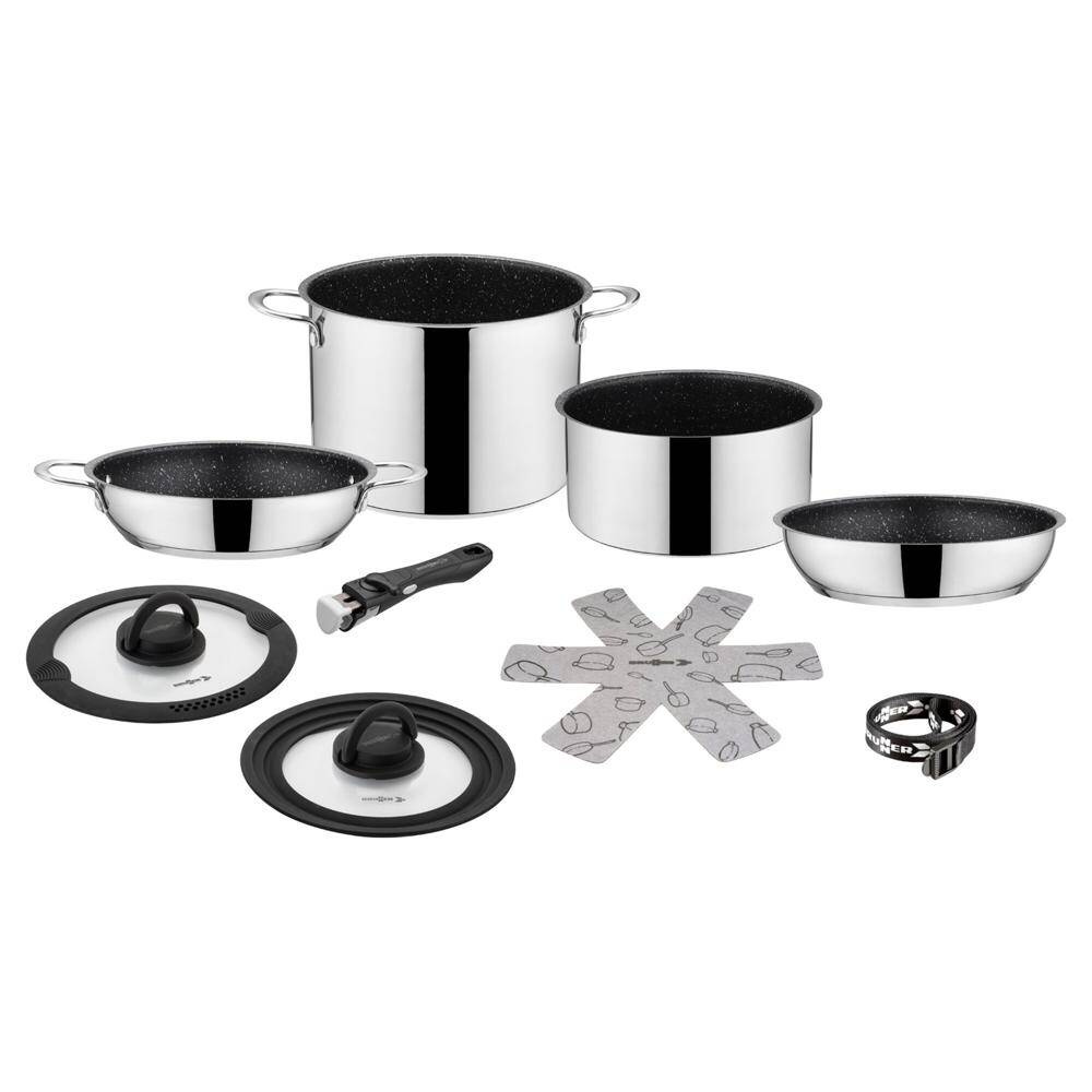 Qualitativ hochwertige Topfsetkollektion aus Edelstahl. Platzsparendes Design, speziell für den Einsatz in Freizeitfahrzeugen und Booten geeignet. Der große Topf und die große Pfanne besitzen feste Griffe und einen Thermoboden. Sie sind für Gas-, Elektro-, Keramik- und Induktionskochfelder geeignet. Spülmaschinengeeignet. Mit Vacublock-System.