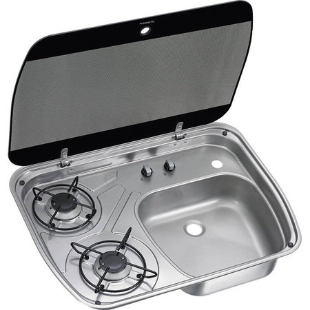 Einbau-Kocher-Spülenkombination mit Abdeckung aus temperaturbeständigem Sicherheitsglas und Bohrung für Wasserhahn ø 27 mm. Mit Sicherheitszündsystem; Leistung 2 x 1,6 kW, Verbrauch 233 g/h. Einbautiefe 14,6 cm, Ausschnittmaße 59 x 43,5 cm, Außenmaße 60 x 44,5 cm, Gewicht 6 kg.