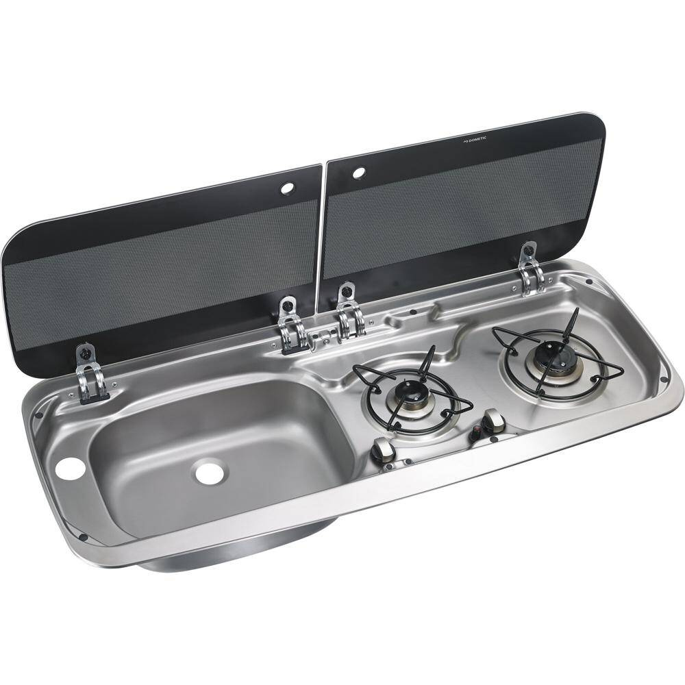 Einbau-Kocher-Spülenkombination mit separaten Abdeckungen aus temperaturbeständigem Sicherheitsglas und Bohrung für Wasserhahn (ø 39 mm), Art.-Nr. 41 555. Mit Sicherheitszündsystem und Piezo-Zündung; Leistung 1 x 1 kW, 1 x 1,8 kW, Verbrauch 204 g/h. Einbautiefe 15,2 cm, Ausschnittmaße 79,3 x 30,7 cm, Außenmaße 90 x 37 cm, Gewicht 7 kg.