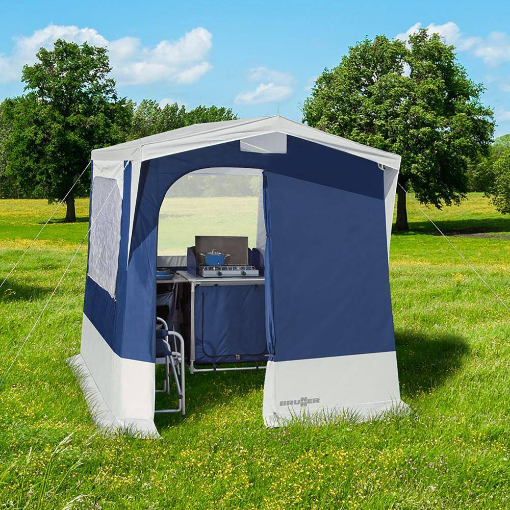 Ideales Koch- und Beistellzelt mit einfachem Pultdach und drei großen, blickdicht verschließbaren Gazefenstern. Die Eingangstür ist rollbar. Mit Erdstreifen rundum. Material: Dach: 100 % PVC Polyvinylchlorid; Wand: 100 % Polyester Oxford. Gestänge: ø 19 mm Stahl.