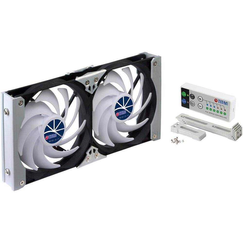 Der 12-Volt-Doppellüfter ist wasserdicht nach IP55. Er ist mit funktionellem Rack-Montageset und einer intelligenten externen Aluminium-Steuereinheit ausgestattet, über die sich die Drehzahl auf zweierlei Weise anpassen lässt: Über eine manuelle 6-stufige Einstellung und über eine temperaturabhängige, sensorgesteuerte Automatik, die nach unten bei 20 °C ausschaltet und bei 45 °C bei maximaler Geschwindigkeit arbeitet. Der integrierte Timer erlaubt 6 unterschiedliche Anlaufzeiten. Trotz des starken Kühleffekts arbeitet der Lüfter sehr leise. Der Lüfter verfügt über einen Überspannungsschutz und kann problemlos im 12-Volt-Bordnetz betrieben werden.