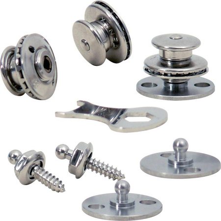 Zur alternativen Befestigung von Abdeckungen und Bodenschürzen an Reisemobilen, die über keine Kederleiste verfügen. Zu jedem Druckknopf ist je ein klebbares und ein schraubbares Unterteil enthalten. Lieferung erfolgt inklusive speziellem Montageschlüssel.