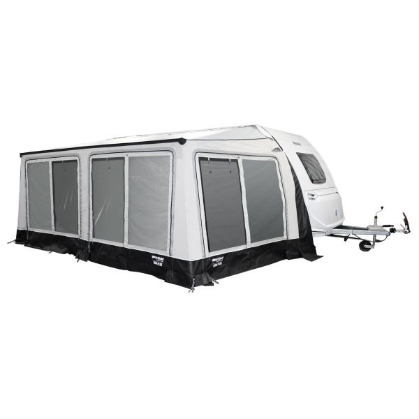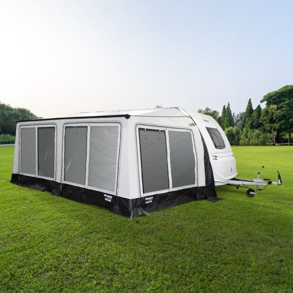 Luna Plus verfügt über zahlreiche sinnvolle Details, die ein gutes Markisenvorzelt haben sollte: Doppelter Faulstreifen, Zwangsentlüftung, abgedeckte Reißverschlüsse, Verdunkelungen für die Fensteröffnungen und eine Schnellfixierung für die aufgeklappten Türen in den Wänden. Verandastangen, eine Bodenschürze und Abspannmaterial sind ebenfalls im Lieferumfang enthalten.