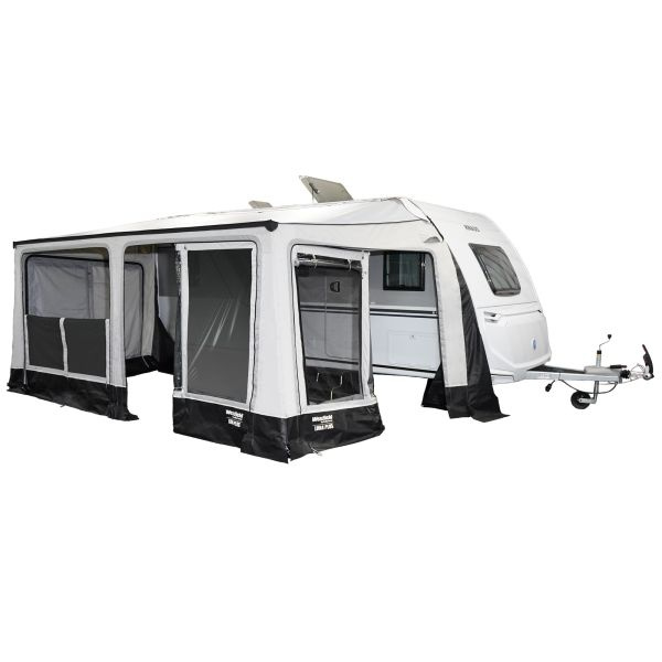 Luna Plus verfügt über zahlreiche sinnvolle Details, die ein gutes Markisenvorzelt haben sollte: Doppelter Faulstreifen, Zwangsentlüftung, abgedeckte Reißverschlüsse, Verdunkelungen für die Fensteröffnungen und eine Schnellfixierung für die aufgeklappten Türen in den Wänden. Verandastangen, eine Bodenschürze und Abspannmaterial sind ebenfalls im Lieferumfang enthalten.