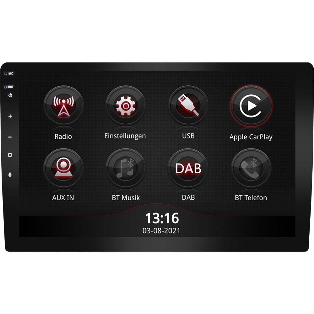 Technische Daten:Bauform 1-DIN, Bildschirmgröße 10,1“ (25,6 cm), Media-Anschlüsse: Eingänge für Dual- oder Front- und Rückfahrkamera, Vorverstärkerausgänge für Front/Subwoofer, AUX, A/V Ausgang hinten, USB, Auflösung 1024 x 600 Pixel, Bluetooth, DAB-Tuner, Kompatibilität Android Auto, Apple CarPlay, 4 x 50 Watt Audio-Verstärker.