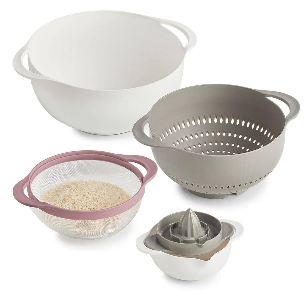 Dieses Multifunktions-Küchenset von Zeller sollte in keiner Küche fehlen! Die praktischen Küchenhelfer lassen sich ineinander stapeln und benötigen so bei der Aufbewahrung nur wenig Platz. Die Zitronenpresse besitzt einen Auffangbehälter mit Abgießer (ø 15 x 7,5 cm) und einer Messskala innen von 100 – 500 ml. Die beiden Siebe sind entweder für das Abgießen von Reis (ø 18,5 x 8 cm) oder das Waschen von Salat (ø 22 x 12 cm) bestens geeignet. Letzterer kann in der weißen Schüssel (ø 26 x 12,5 cm) angerichtet und serviert werden. Hergestellt ist das Set aus robustem Kunststoff. Weiß, grau, beere.