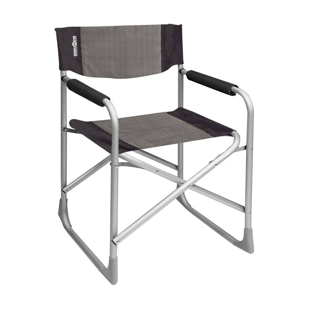 Kompakter Regiestuhl mit solidem Gestell aus eloxiertem Alurohr. Platzsparende Ausführung. Stabil und sehr leicht. Gepolsterte Armlehnen. Mit Sicherheits-Klappmechanismus. Belastbar bis 100 kg.