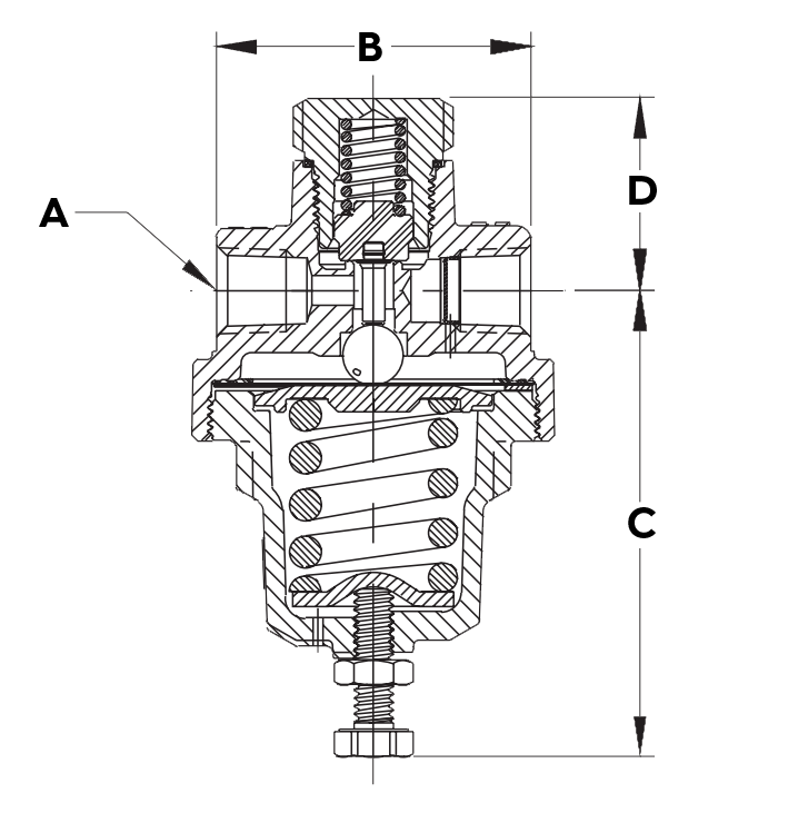 | Teil Nummer | Einlass-/Auslassanschlüsse (F.NPT) | "A" | "B" | "C" | "D" | Werkseitige Druckeinstellung (psig) | Betriebsbereich (psig) |