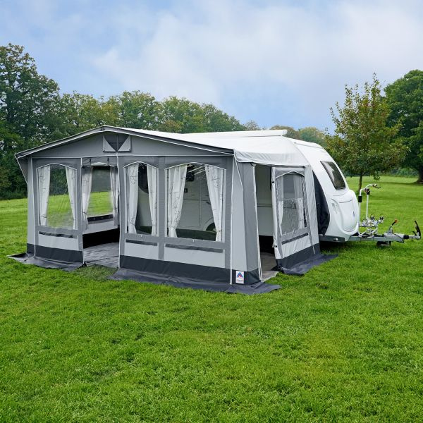 Abgedeckte Reißverschlüsse und verschließbare Fensterklappen vorne und seitlich bieten optimalen Schutz. Seitlich befindet sich eine Kombination aus Gaze, klarer und dunkler Abdeckung sowie eine verschließbare Dauerhochentlüftung für frische Luft. Der seitliche Keder für Regenrinnen und der Keder zur Erkeranbringung an der rechten Seite sorgen für zusätzliche Flexibilität. Vier Sturmgurtclips (das Sturmgurtset ist optional erhältlich) sowie Klett- und Flauschbänder in der Vorderwand für die Senkrechtstange bieten zusätzliche Stabilität bei widrigen Wetterbedingungen.