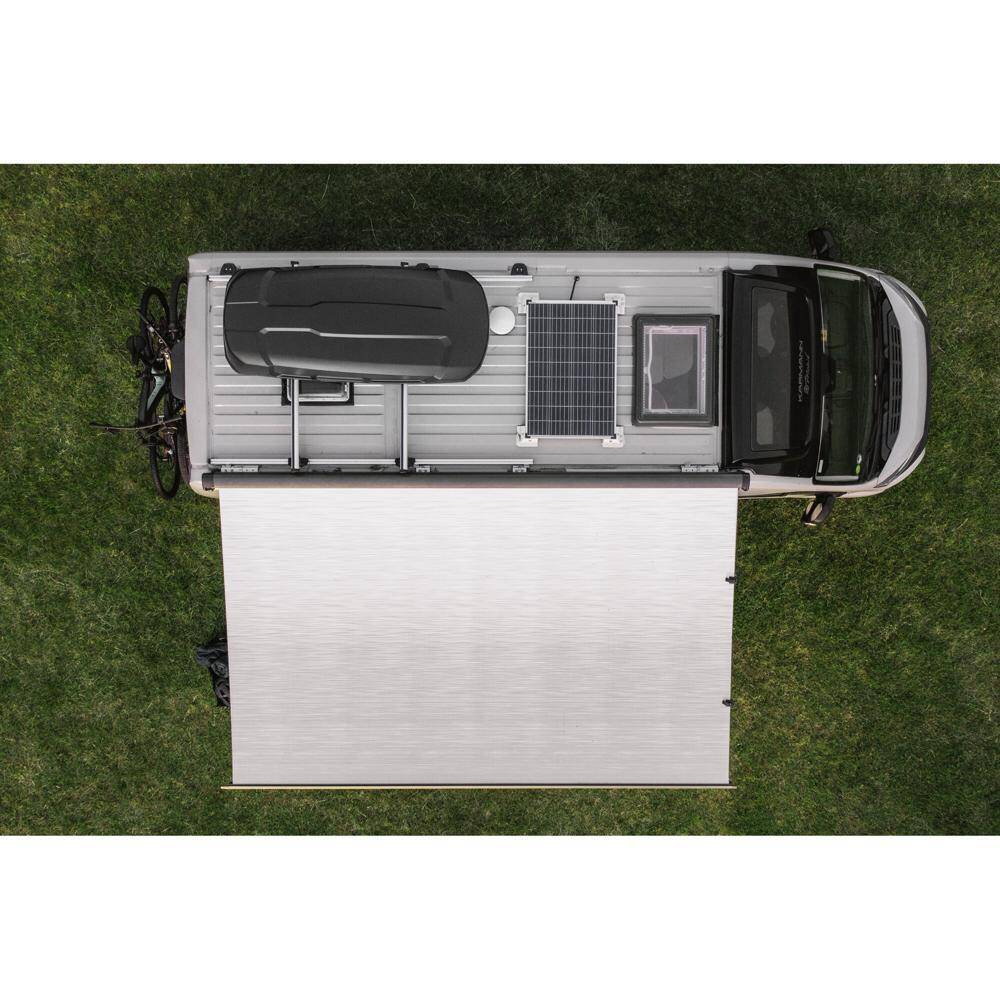 Flexible Dachträgerlösung für den Fiat Ducato ab Baujahr 2006/07 mit H2 Dach, Schienenlänge 1,64 m, Traglast 100 kg. Es ist konzipiert für Campervans bei denen Dachaufbauten, wie zum Beispiel Dachhauben oder Kühlschrankentlüftung, die Montage einer durchgehenden Längsschiene verhindern. Die Befestigung erfolgt ohne Bohren an 4 Befestigungspunkten des Fahrzeugs und einer vollflächigen Verklebung, wobei das Dach im Bereich der Längsschienen von den Befestigungspunkten 10 cm nach innen frei von Hindernissen sein muss. Das System ist kompatibel mit einer Markise Thule Omnistor 6300 in der Länge 3,25, 3,75 oder 4 m. Diese muss am Adapter 90 628 (3,25 m) bzw. 90 629 (3,75 m / 4 m) montiert sein. Es kann jedoch auch ohne Markise verwendet werden um z. B. Querträger oder Halterungen für Sportausrüstung (siehe Katalogseite 209) zu montieren.
