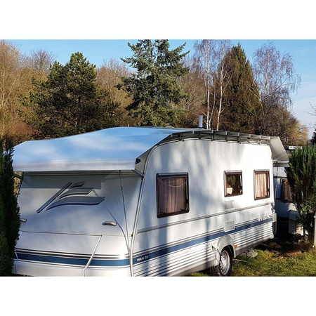>Typ 1: Wohnwagen-SchutzdachSchutzdachbügel und Füße aus Aluminium, in der Breite verstellbar. Trägerabstand ca. 55 cm. Die Aluträger werden mittels Kederband in die Plane eingezogen. Bugüberstand serienmäßig 60 cm, Hecküberstand 40 cm. Lieferbare Schutzdachbreiten 247 cm, 272 cm, 297 cm; 350 cm gegen 10 % Aufpreis.Die Herstellung erfolgt für jeden Wohnwagen als Einzelstück, daher bitte unbedingt Wohnwagentyp und Modelljahr, das Vorhandensein einer Klimaanlage sowie gewünschte Breite und Farbe angeben! Die Lieferung erfolgt innerhalb Deutschlands (zzgl. 90,00 Versandkosten), Österreichs, Belgiens, Luxemburgs und den Niederlanden (zzgl. je 120,00 Versandkosten) direkt von Fa. Nellen. Für andere Staaten Frachtkosten sowie Montagepreise auf Anfrage!– Andere Schutzdachtypen und Panorama-Ausführung auf Anfrage! –