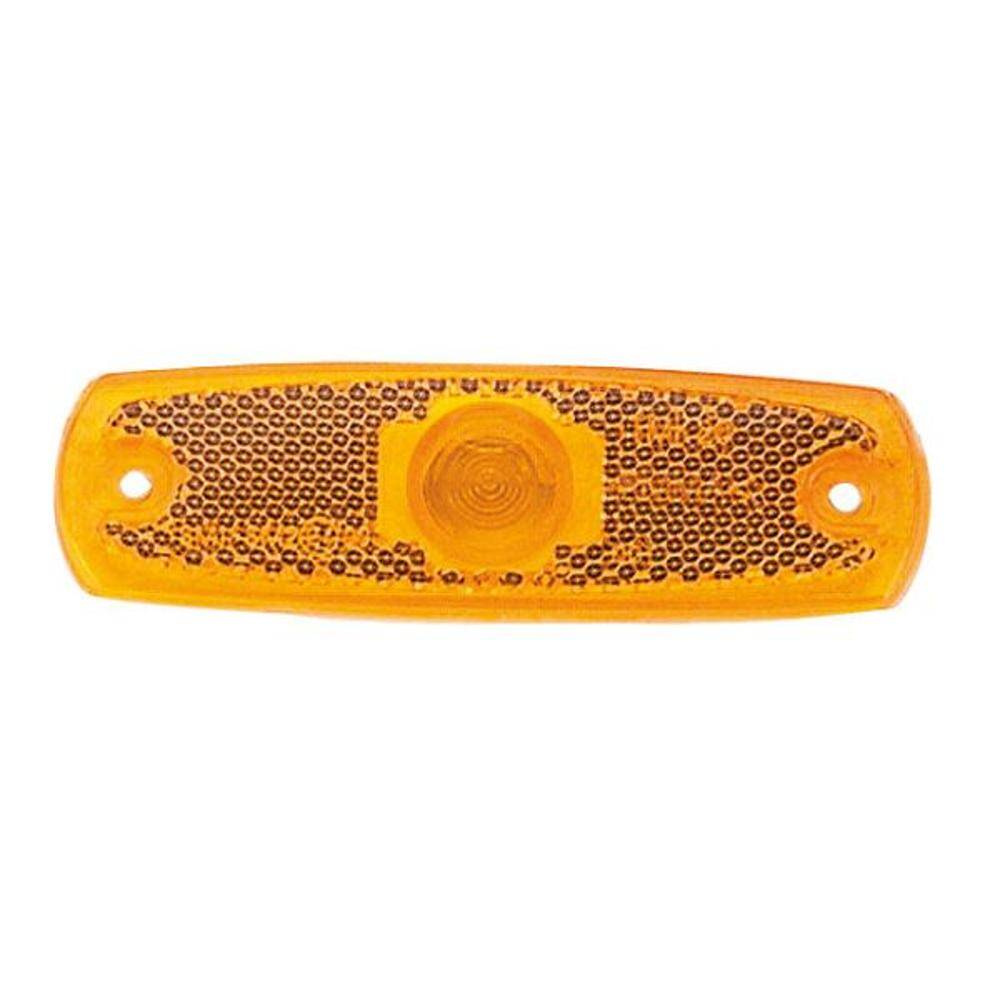 Waagerechter oder senkrechter Einbau. Lichtscheibe gelb. Mit 12-V-Glühlampe. Grundplatte aus weißem Kunststoff (zum Kaschieren von welligen Außenwänden z. B. Caravan).