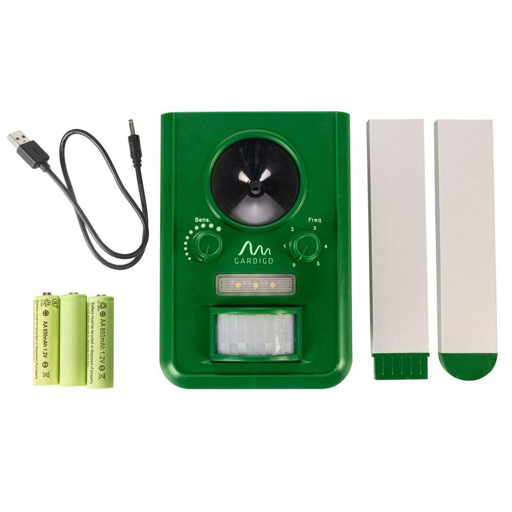 Das Gerät wird inkl. Erdspieß, Akkus und Ladekabel geliefert. Reichweite: bis zu 10 m. Frequenz: 19,5 kHz – 23,5 kHz: bei Hunden, Katzen, Vögeln und Mardern; 23,5 kHz – 27,5 kHz: bei Füchsen, Wildschweinen und Wild; 27,5 kHz – 31,5 kHz: bei Mäusen u. a. kleinen Nagetieren. Einstellbar: nur LED-Blitzlicht – alle Frequenzen und Blitzlicht.