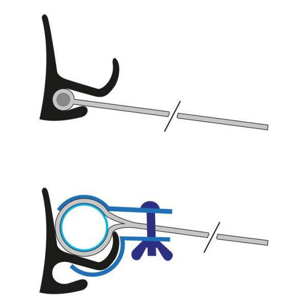 Bei diesem Sonnendach haben Sie zwei verschiedene Befestigungsmöglichkeiten. Sie können es mittels Keder in eine Kederschiene einziehen (z. B. die Multirailschiene oder andere handelsübliche Kederschienen). Die zweite Möglichkeit ist die Anbringung mit einem Schleusenstab (ist im Lieferumfang enthalten). Dieser wird in den vorhandenen Hohlsaum des Sonnendachs geschoben und dann in die Regenrinne des Fahrzeugs gelegt (siehe Skizze). Mit den mitgelieferten Klemmen fixieren Sie diesen. Beide Größen enthalten drei Aufstellstangen.