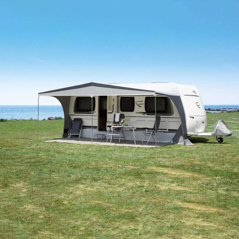 Material: Dach außenseitig aus PVC-beschichtetem Polyestergewebe; Vorderwand und Seitenwände aus trailtex-Gewebe, einseitig PU-beschichtet; Fenster aus hochwertiger Folie mit hoher UV-Stabilität.